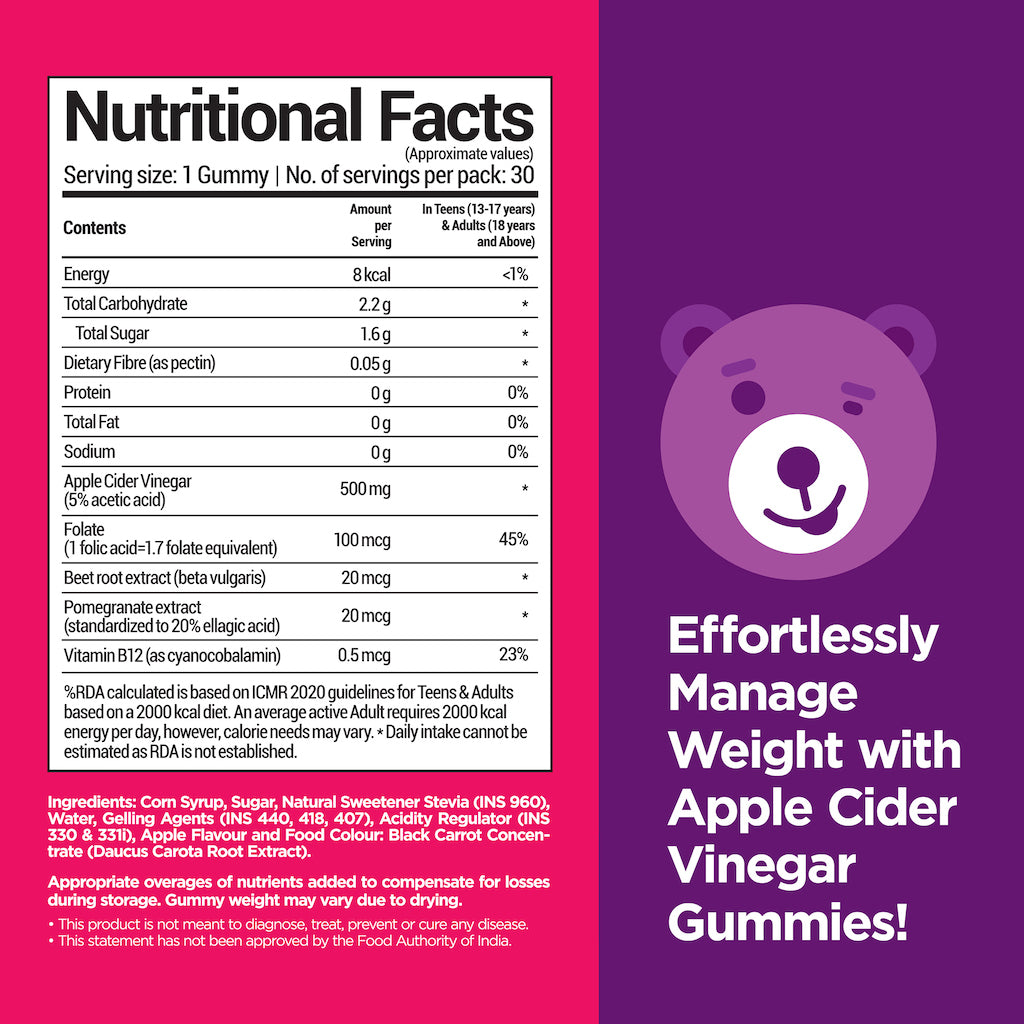 Natural Apple Cider Vinegar, Natural Beetroot extract & Pomegranate extract, Pectin, Essentital Vitamin Blend.